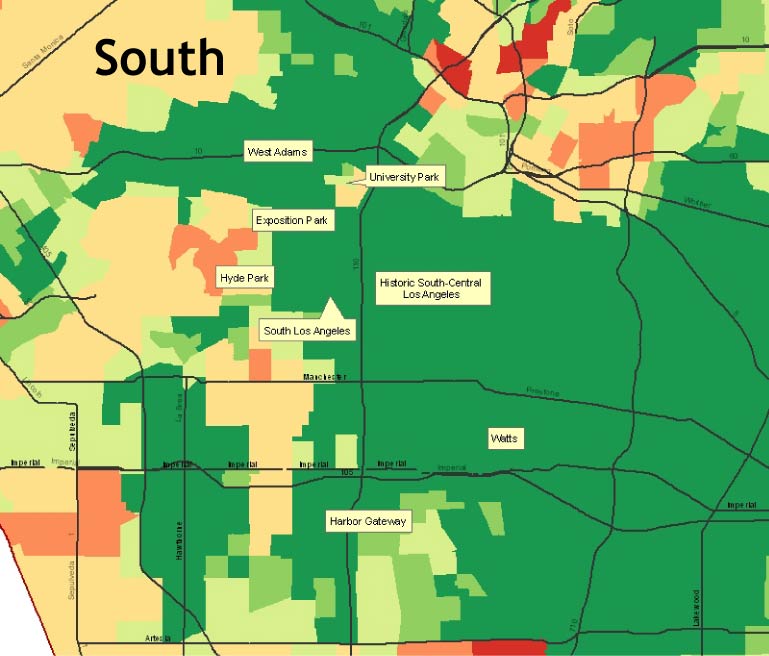 Here, I have included smaller, focused maps of different regions of the Los Angeles urban area to point out particular neighborhoods and communities that show varying levels of overall change in percent Hispanic populations between 1960 and 2000. In this map, note the different region names and locations as well as general trends in change over the entire study period.